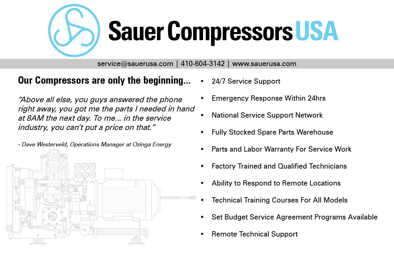 Sauer Compressors USA manufactures world-class air and gas compressor systems. With origins in Kiel, Germany circa 1884, Sauer has grown from serving European Naval markets to virtually every industrial sector worldwide. We specialize in high-pressure, continuous duty air and gas compressors, back with 24/7 support, extensive spares stock, multiple regional offices across the country, and the only Lifetime Warranty in the high-pressure market. With more than 53 of the world’s navies relying on Sauer Compressors, we know what it means to serve our customers. To discuss your application, from spare parts to complete turn-key plants, please browse our website, call (410) 604-3142, or email sales@sauerusa.com.